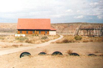 This is a view from the south side of the church. The church was designed to blend harmoniously with it's environment. Going across the picture and passing behind the church you can see a narrow gray strip about even with the base of the church. This is Chaco Wash which is more than one hundreds yards across. The pole structure to the right of the church is a typical construction used by the Navajo for their living quarters during the hot months of the year. The line of semi-buried tires marks the northern limit of the playground field. The dormitory would be to the immediate left in this picture and the school is directly behind the viewer of the picture.